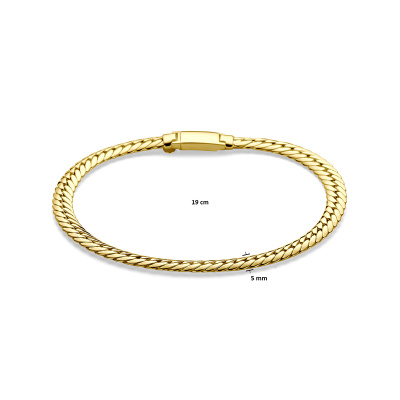 This best price curb bracelet with the name Joke is made of 14 Carat gold and is an exquisite fashion item to complete your outfit. A plus is that it is easily combined with other bracelets, so you can create a unique own style. This traditional gold plane curb bracelet is truly eye-catching by itself too. The width of the bracelet is ±0.20 in (5 mm) and it is hollow.After expressing your wishes and preferences, our jewel designers will design your bracelet. Subsequently, our goldsmiths will start their creative process in our own DiamondsByMe artisan studio. Our jewels are made according the latest modern techniques, combined with ancient craftsmanship, so our goldsmiths can design your bracelet to perfection. Very soon after this, you will be wearing a unique, handmade bracelet!A customized traditional best price bracelet is the perfect gift! New exquisite designs are added daily by our team of passionate goldsmiths. And each design can be customized. Simply customize the precious metals and the color of gemstones which will be used, for example. This makes your design of the traditional Joke bracelet truly unique!Our team of talented, passionate designers add new bracelet designs to our online collection daily. Our objective in doing so, is to be able to offer you a wide variety of jewels. Please feel free to request a quote if you have specific wishes for your bracelet. We guarantee to make you an offer you can't refuse.By using a combination of the latest modern techniques, combined with ancient crafting, we can make all our bracelets in our own studio. Each jewel is made to order. This is advantageous because we can offer you a price you won't find anywhere else.To make it easier for you, we offer a 30 day return policy. Check our terms and conditions.