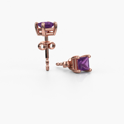 Solitaire stud earrings are contemporary yet fashionable pieces of jewelry. In solitaire stud earrings, the prong setting is open and only 1 stone is set, which helps reflect light on the gemstone from every angle. Because the amethysten are positioned higher, these contemporary stud earrings become truly eye-catching. We carefully create each detail of these solitaire stud earrings by hand. Our expert goldsmiths set the amethysten in these rose gold stud earrings with the utmost precision, so light reflects evenly from every angle. The stud earrings are set with 4 mm princess amethysten. The Sam square earrings are made to embellish your ears. Each jewel is lovingly made by hand by our goldsmiths.. Our goldsmiths passionately create your customized stud earrings to your liking with the utmost care. The rose gold set stud earrings, as shown here, can be customized using our online tool. Feel free to ask our jewel designers for assistance if you want changes made which are unavailable in our online tool. We are happy to answer your questions. By using a combination of the latest modern techniques, combined with ancient crafting, we can make all our stud earrings in our own studio. Each jewel is made to order. This is advantageous because we can offer you a price you won't find anywhere else. To make it easier for you, we offer a 30 day return policy. Check our terms and conditions.