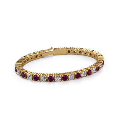 This affordable and timeless gold tennis bracelet can easily be combined with many different styles of fashion. The Karin 5 mm tennis bracelet is pave set with stunning rhodolite total 5 mm, which are set with great care so light reflects perfectly. Because your vintage tennis bracelet is handmade, extra care is taken in finishing the tiniest details to perfection. Did you know, the tennis bracelet is named after Chris Evert, the tennis player? She lost her tennis bracelet during the US Open of 1987 and the match was stopped to retrieve her precious diamond line tennis bracelet. The tennis bracelet is called tennis bracelet ever since and many celebrities such as Serena Williams and Katy Perry have been spotted wearing them. Due to its comfort and elegance the tennis bracelet continues to be a popular piece of jewelry. A customized vintage affordable tennis bracelet is the perfect gift! New exquisite designs are added daily by our team of passionate goldsmiths. And each design can be customized. Simply customize the precious metals and the color of gemstones which will be used, for example. This makes your design of the vintage Karin 5 mm tennis bracelet truly unique!Our team of talented, passionate designers add new tennis bracelet designs to our online collection daily. Our objective in doing so, is to be able to offer you a wide variety of jewels. Please feel free to request a quote if you have specific wishes for your tennis bracelet. We guarantee to make you an offer you can't refuse.Because we design and deliver our own tennis bracelets, we can offer you a tennis bracelet at a price you won't find anywhere else. A tennis bracelet is made to order, which helps prevent excess supplies, so we can make you a great price offer. We understand it feels risky, buying your tennis bracelet online, but we will gladly assist in the designing process, taking your budget into consideration.To make it easier for you, we offer a 30 day return policy. Check our terms and conditions.