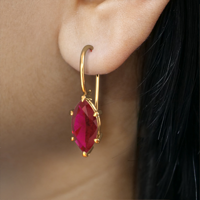 If you are looking for trendy and personal drop earrings, then these will fit you perfectly. You have the option to add your birthstones to these drop earrings. Each month has its own birthstone. You may use your own birthstone gemstone or that of your children. A priceless gift, even if it is for yourself. Our expert jeweler will set the selected stones in your drop earrings with utter precision, so light reflects evenly from every angle. Here, 12x6 mm marquise ruby gemstones were used to adorn these gold daring Cleo MRQ drop earrings. The Cleo MRQ earrings are made to embellish your ears. Each jewel is lovingly made by hand by our goldsmiths.. What could possibly be more beautiful than personally designed trendy drop earrings, handmade by yours truly? Please, feel free to customize each model by choosing different precious metals and gemstones. This makes your drop earrings truly unique. These drop earrings can be customized to your liking. It goes without saying that you can also ask us for help. We are more than willing to assist in designing your trendy drop earrings. If you like but still have specific wishes concerning customizing your design, such as adding a gemstone which isn't mentioned in the list, feel free to contact us. We will gladly inform you on different options. Because we design and deliver our own drop earrings, we can offer you drop earrings at a price you won't find anywhere else. drop earrings are made to order, which helps prevent excess supplies, so we can make you a great price offer. We understand it feels risky, buying your drop earrings online, but we will gladly assist in the designing process, taking your budget into consideration.To make it easier for you, we offer a 30 day return policy. Check our terms and conditions.