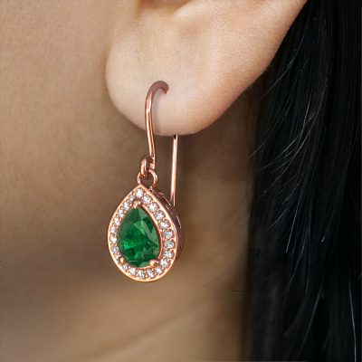 This is our set of trendy Beverlee 1 drop earrings. In this example the drop earrings are set with pear emerald. Each of our emeralds gemstones is carefully selected and positioned in your drop earrings with great precision so light hits the emerald from every angle. We believe these drop rose gold drop earrings look best set with colored gemstones. But that is entirely up to you. Our goldsmiths passionately create your customized drop earrings to your liking with the utmost care. The rose gold set drop earrings, as shown here, can be customized using our online tool. Feel free to ask our jewel designers for assistance if you want changes made which are unavailable in our online tool. We are happy to answer your questions.After receiving your order, our goldsmiths will passionately start the creative process of making your drop earrings in our own studio. Because we don't have a big stockpile, these costs will not be passed on to you. Our pricing is proof of that! We offer top quality jewels at lowest price, guaranteed.To make it easier for you, we offer a 30 day return policy. Check our terms and conditions.