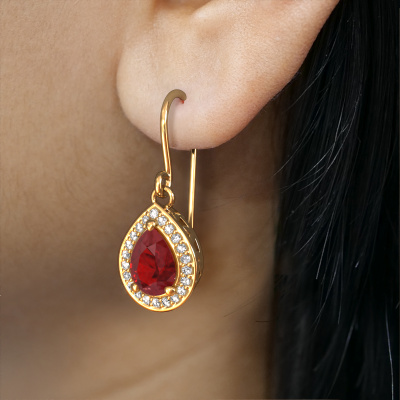 This is our set of trendy Beverlee 1 drop earrings. In this example the drop earrings are set with pear ruby. Each of our ruby gemstones is carefully selected and positioned in your drop earrings with great precision so light hits the ruby from every angle. We believe these drop gold drop earrings look best set with colored gemstones. But that is entirely up to you. Our goldsmiths passionately create your customized drop earrings to your liking with the utmost care. The gold set drop earrings, as shown here, can be customized using our online tool. Feel free to ask our jewel designers for assistance if you want changes made which are unavailable in our online tool. We are happy to answer your questions.After receiving your order, our goldsmiths will passionately start the creative process of making your drop earrings in our own studio. Because we don't have a big stockpile, these costs will not be passed on to you. Our pricing is proof of that! We offer top quality jewels at lowest price, guaranteed.To make it easier for you, we offer a 30 day return policy. Check our terms and conditions.
