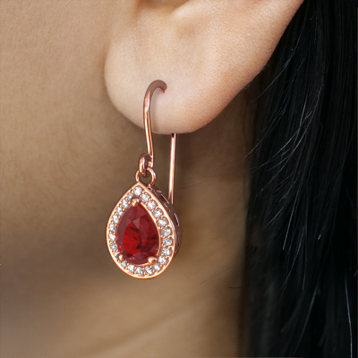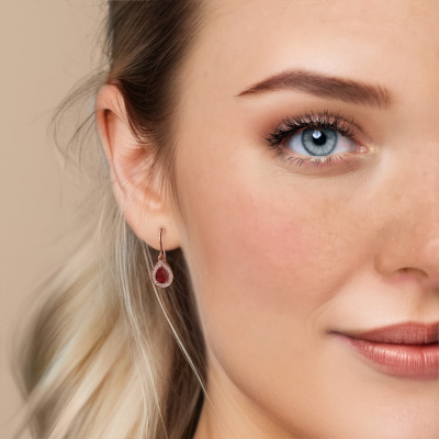 This is our set of trendy Beverlee 1 drop earrings. In this example the drop earrings are set with pear ruby. Each of our ruby gemstones is carefully selected and positioned in your drop earrings with great precision so light hits the ruby from every angle. We believe these drop rose gold drop earrings look best set with colored gemstones. But that is entirely up to you. Our goldsmiths passionately create your customized drop earrings to your liking with the utmost care. The rose gold set drop earrings, as shown here, can be customized using our online tool. Feel free to ask our jewel designers for assistance if you want changes made which are unavailable in our online tool. We are happy to answer your questions.After receiving your order, our goldsmiths will passionately start the creative process of making your drop earrings in our own studio. Because we don't have a big stockpile, these costs will not be passed on to you. Our pricing is proof of that! We offer top quality jewels at lowest price, guaranteed.To make it easier for you, we offer a 30 day return policy. Check our terms and conditions.