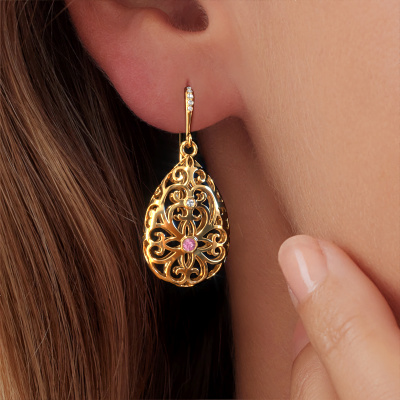How would you describe your style? Are you looking for something slightly different? These unique filigree gold drop earrings are unique and created by our expert goldsmiths. These unique drop earrings are set with pink sapphire. Each of the pink sapphire is carefully selected, because we believe your drop earrings should be adorned with nothing but the most exquisite gemstones. Wouldn't you agree? The Idalia 2 earrings are unique pieces of jewelry because they can be customized to your liking.. Our goldsmiths passionately create your customized drop earrings to your liking with the utmost care. The gold set drop earrings, as shown here, can be customized using our online tool. Feel free to ask our jewel designers for assistance if you want changes made which are unavailable in our online tool. We are happy to answer your questions.After receiving your order, our goldsmiths will start the creative process of making your Idalia 2 drop earrings. We don't keep stock. This is advantageous because these costs will not be passed on to you. Therefore, we can offer jewelry at exceptionally low prices. To make it easier for you, we offer a 30 day return policy. Check our terms and conditions.