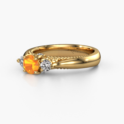 This 14 Carat gold ring is called Tiffani and is set with 5 mm citrin. This exclusive gold 3-stone engagement ring is a true work of art! The ornaments are crafted with a lot of patience and great passion. In order to create this ring with great precision, this craft requires a keen eye and skillful hand. A challenge which ignites a fire in our expert goldsmith. The exquisite citrin are set in a special way so they stand out even more. This gives the ring an even more glamorous appearance. The ajour engagement ring is actually unique on its own because of the gemstones which we carefully select especially for this ring. On top of that you select the precious metals which will be used to create a unique ring for the most extraordinary woman in your life! This jewel is made just for you by our master goldsmiths in our own studio.After receiving your order, our goldsmiths will passionately start the creative process of making your engagement ring in our own studio. Because we don't have a big stockpile, these costs will not be passed on to you. Our pricing is proof of that! We offer top quality jewels at lowest price, guaranteed.Have you found a specific engagement ring somewhere which you would like to give to your loved one? Please feel free to express your wishes to our jewel designers because we would be honored to turn your design into a unique engagement ring. You can follow the development of your ring design because we use 3D drawings. This gives you a realistic preview of how your design will look. You can also preorder a dummy. A dummy is a plastic ring, which can be shaped according your ring design. You can try it on and check if its width and size are suitable for you. We will gladly send you a non-binding offer, based on a fair price/ quality ratio. It will amaze you, considering the quality of the ring and gemstones.To make it easier for you, we offer a 30 day return policy. Check our terms and conditions.