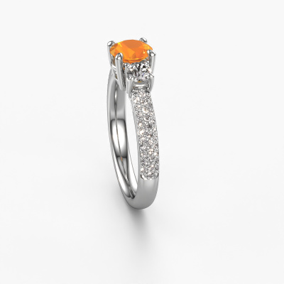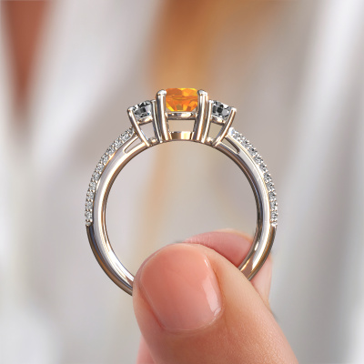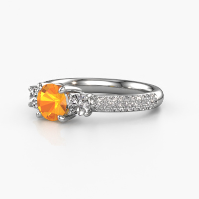 This platinum ring is called Marielle RND and is set with 6 mm citrin. This exclusive platinum 3-stone engagement ring is a true work of art! The ornaments are crafted with a lot of patience and great passion. In order to create this ring with great precision, this craft requires a keen eye and skillful hand. A challenge which ignites a fire in our expert goldsmith. The exquisite citrin are set in a special way so they stand out even more. This gives the ring an even more glamorous appearance. The tasteful engagement ring is actually unique on its own because of the gemstones which we carefully select especially for this ring. On top of that you select the precious metals which will be used to create a unique ring for the most extraordinary woman in your life! This jewel is made with passion and love by one of our master goldsmiths.By using a combination of the latest modern techniques, combined with ancient crafting, we can make all our engagement rings in our own studio. Each jewel is made to order. This is advantageous because we can offer you a price you won't find anywhere else.Our designers and goldsmiths work together each day, creating new jewels. Perhaps you have found a nice exclusive engagement ring somewhere, which can be used to customize your unique ring. Please feel free to contact us. We will make you an offer, based on a fair price/ quality ratio, which will amaze you.To make it easier for you, we offer a 30 day return policy. Check our terms and conditions.