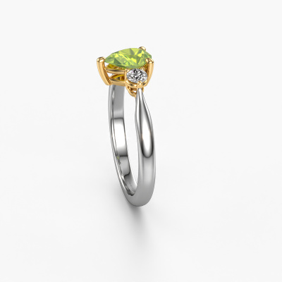 This 14 Carat white gold ring is called Lieselot PER and is set with 7x5 mm peridot. For you, there is only one person in your life who stands out in a crowd. Only one that makes your heart skip a beat. A true gem! She, above all others, deserves a special gift. A unique customized jewel made in her honor. We believe this ring is perfect for your special moment. Each detail of this exclusive white gold 3-stone engagement ring is selected by hand, crafted and polished by our expert goldsmith in our own artisan studio. We strive to achieve the perfect design and composition of the ring, so it enhances the unique features of our peridot, and lets them shine even brighter. It takes a lot of precision to make but in the end it pays off because of the sheer beauty of the ring. And that is our main goal. It's what gets us excited. The great thing about our online tool is, that you can design your own jewelry into a unique, personalized piece. This unique special engagement ring is created with the precious metal combination of white gold and gold. But of course you are completely free to select other colors. Each piece of jewelry is made with passion and love by one of our master goldsmiths.Are you on a budget? Please feel free to contact us, so we can go discuss your options. We offer our engagement rings at guaranteed best price, because we make them to order. You won't find such a price anywhere else!Different styles of new rings are made daily by our team. Perhaps you have found a 3-stone engagement ring somewhere. One you would like to give to your loved one. Please feel free to share your thoughts and design with our jewel designers. We would love to turn your design into a fashionable engagement ring. You can follow the development of your ring design because we use very detailed 3D drawings. On top of that, you can order a dummy of the design. A dummy is a plastic ring, which can be shaped according your ring design. You can try it on and check if the engagement ring is up to standard. We will gladly send you a non-binding offer, based on a fair price/ quality ratio. The offer will baffle you, considering the quality of the ring and gemstones.To make it easier for you, we offer a 30 day return policy. Check our terms and conditions.