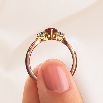 This 14 Carat rose gold ring is called Lieselot PER and is set with 7x5 mm ruby. For you, there is only one person in your life who stands out in a crowd. Only one that makes your heart skip a beat. A true gem! She, above all others, deserves a special gift. A unique customized jewel made in her honor. We believe this ring is perfect for your special moment. Each detail of this exclusive rose gold 3-stone engagement ring is selected by hand, crafted and polished by our expert goldsmith in our own artisan studio. We strive to achieve the perfect design and composition of the ring, so it enhances the unique features of our ruby, and lets them shine even brighter. It takes a lot of precision to make but in the end it pays off because of the sheer beauty of the ring. And that is our main goal. It's what gets us excited. The great thing about our online tool is, that you can design your own jewelry into a unique, personalized piece. This unique special engagement ring is created with the precious metal combination of rose gold and gold. But of course you are completely free to select other colors. Each piece of jewelry is made with passion and love by one of our master goldsmiths.Are you on a budget? Please feel free to contact us, so we can go discuss your options. We offer our engagement rings at guaranteed best price, because we make them to order. You won't find such a price anywhere else!Different styles of new rings are made daily by our team. Perhaps you have found a 3-stone engagement ring somewhere. One you would like to give to your loved one. Please feel free to share your thoughts and design with our jewel designers. We would love to turn your design into a fashionable engagement ring. You can follow the development of your ring design because we use very detailed 3D drawings. On top of that, you can order a dummy of the design. A dummy is a plastic ring, which can be shaped according your ring design. You can try it on and check if the engagement ring is up to standard. We will gladly send you a non-binding offer, based on a fair price/ quality ratio. The offer will baffle you, considering the quality of the ring and gemstones.To make it easier for you, we offer a 30 day return policy. Check our terms and conditions.