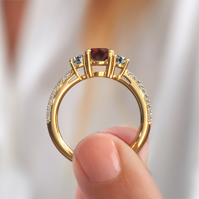 This 14 Carat gold ring is called Marielle RND and is set with 6 mm garnet. This exclusive gold 3-stone engagement ring is a true work of art! The ornaments are crafted with a lot of patience and great passion. In order to create this ring with great precision, this craft requires a keen eye and skillful hand. A challenge which ignites a fire in our expert goldsmith. The exquisite garnet are set in a special way so they stand out even more. This gives the ring an even more glamorous appearance. The tasteful engagement ring is actually unique on its own because of the gemstones which we carefully select especially for this ring. On top of that you select the precious metals which will be used to create a unique ring for the most extraordinary woman in your life! This jewel is made with passion and love by one of our master goldsmiths.By using a combination of the latest modern techniques, combined with ancient crafting, we can make all our engagement rings in our own studio. Each jewel is made to order. This is advantageous because we can offer you a price you won't find anywhere else.Our designers and goldsmiths work together each day, creating new jewels. Perhaps you have found a nice exclusive engagement ring somewhere, which can be used to customize your unique ring. Please feel free to contact us. We will make you an offer, based on a fair price/ quality ratio, which will amaze you.To make it easier for you, we offer a 30 day return policy. Check our terms and conditions.