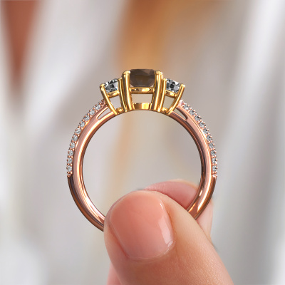 This 14 Carat rose gold ring is called Marielle RND and is set with 6 mm smokey quartz. This exclusive rose gold 3-stone engagement ring is a true work of art! The ornaments are crafted with a lot of patience and great passion. In order to create this ring with great precision, this craft requires a keen eye and skillful hand. A challenge which ignites a fire in our expert goldsmith. The exquisite smokey quartz are set in a special way so they stand out even more. This gives the ring an even more glamorous appearance. The tasteful engagement ring is actually unique on its own because of the gemstones which we carefully select especially for this ring. On top of that you select the precious metals which will be used to create a unique ring for the most extraordinary woman in your life! This jewel is made with passion and love by one of our master goldsmiths.By using a combination of the latest modern techniques, combined with ancient crafting, we can make all our engagement rings in our own studio. Each jewel is made to order. This is advantageous because we can offer you a price you won't find anywhere else.Our designers and goldsmiths work together each day, creating new jewels. Perhaps you have found a nice exclusive engagement ring somewhere, which can be used to customize your unique ring. Please feel free to contact us. We will make you an offer, based on a fair price/ quality ratio, which will amaze you.To make it easier for you, we offer a 30 day return policy. Check our terms and conditions.