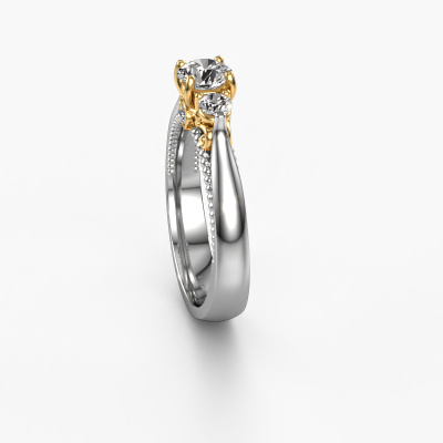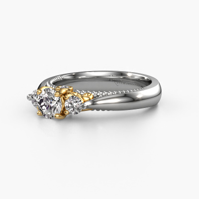 This 14 Carat white gold ring is called Tiffani and is set with 5 mm zirconia. This exclusive white gold 3-stone engagement ring is a true work of art! The ornaments are crafted with a lot of patience and great passion. In order to create this ring with great precision, this craft requires a keen eye and skillful hand. A challenge which ignites a fire in our expert goldsmith. The exquisite cz-stones are set in a special way so they stand out even more. This gives the ring an even more glamorous appearance. The ajour engagement ring is actually unique on its own because of the gemstones which we carefully select especially for this ring. On top of that you select the precious metals which will be used to create a unique ring for the most extraordinary woman in your life! This jewel is made just for you by our master goldsmiths in our own studio.After receiving your order, our goldsmiths will passionately start the creative process of making your engagement ring in our own studio. Because we don't have a big stockpile, these costs will not be passed on to you. Our pricing is proof of that! We offer top quality jewels at lowest price, guaranteed.Have you found a specific engagement ring somewhere which you would like to give to your loved one? Please feel free to express your wishes to our jewel designers because we would be honored to turn your design into a unique engagement ring. You can follow the development of your ring design because we use 3D drawings. This gives you a realistic preview of how your design will look. You can also preorder a dummy. A dummy is a plastic ring, which can be shaped according your ring design. You can try it on and check if its width and size are suitable for you. We will gladly send you a non-binding offer, based on a fair price/ quality ratio. It will amaze you, considering the quality of the ring and gemstones.To make it easier for you, we offer a 30 day return policy. Check our terms and conditions.