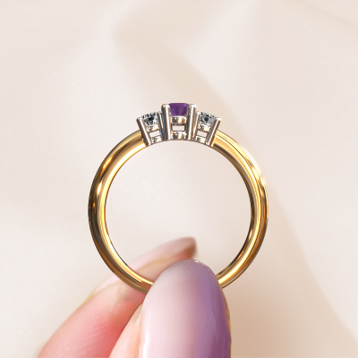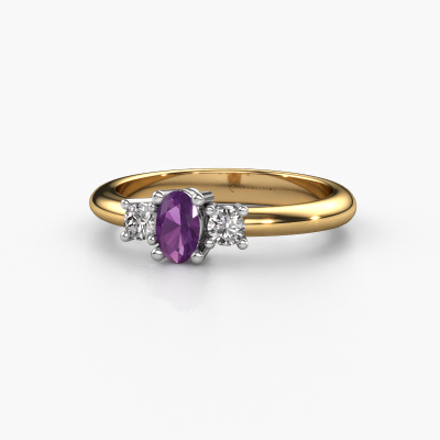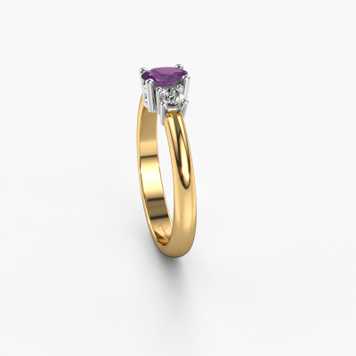 This 14 Carat gold ring is called Karie and is set with amethyst. How would you describe the style of the love of your life? Does she have a unique sense of style? This stunning ajour gold engagement ring can be custom made to your own or her liking. Our amethysten gemstones have been carefully selected because we believe your traditional engagement ring must be adorned with nothing but the most beautiful gemstone. Don't you agree? This jewel is made just for you by our master goldsmiths in our own studio.After receiving your order, our goldsmiths will passionately start the creative process of making your engagement ring in our own studio. Because we don't have a big stockpile, these costs will not be passed on to you. Our pricing is proof of that! We offer top quality jewels at lowest price, guaranteed.Do you have a specific ring in mind? One you came across somewhere. Please feel free to tell us your wishes and we will turn your design into a unique engagement ring. You can follow the development of your ring design because we use 3D drawings. This gives you a realistic preview of your design. We will gladly send you a non-binding offer, based on a fair price/ quality ratio. It will amaze you.To make it easier for you, we offer a 30 day return policy. Check our terms and conditions.