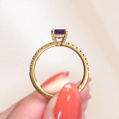 The ring shown above is called the Saskia eme 1, we call this a solitaire ring because it contains a single gemstone. The engagement ring is made in 14 Carat gold and has a emerald cut amethyst of 7x5 mm. The cool thing about our configurator is that you can compile your own piece of jewelry, into a completely personalized one. This solitaire ring is crafted in the precious metals gold with gold, but of course you are free to pick your own colors. Each piece of jewelry is made with passion and love by one of our master goldsmiths.The solitaire ring is a special type of engagement ring. Its open prong setting allows light to strike the gemstone from various angles. This exclusive engagement ring is a stunning eye-catcher because of the high positioning of the gemstone. In order for you to commemorate your proposal with a unique ring, we carefully adorn this solitaire ring by hand. The love of your life deserves nothing but the best. After receiving your order, our goldsmiths will passionately start the creative process of making your engagement ring in our own studio. Because we don't have a big stockpile, these costs will not be passed on to you. Our pricing is proof of that! We offer top quality jewels at lowest price, guaranteed.Our team adds new designs to our online collection daily. Our designers and goldsmiths work together in creating the best design. We strive to offer a diverse collection of jewels. Perhaps you have a specific jewel design in mind. One you came across somewhere. Please contact us for a free consultation. We will make you an offer, based on a fair price/ quality ratio, that will baffle you.To make it easier for you, we offer a 30 day return policy. Check our terms and conditions.
