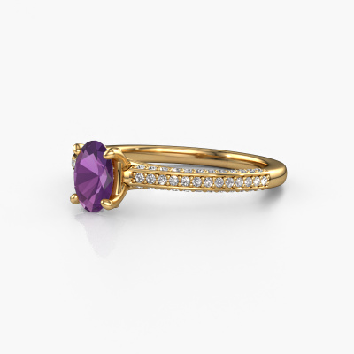 The ring shown above is called the Elenore ovl. We call this type of ring a pavé solitaire ring because it has one center gemstone and a band that is also pave set with gemstones. This engagement ring is made in 14 Carat gold set with a 6.5x4.5 mm oval amethyst, and pave set diamonds at the sides. Each piece of jewelry is made by a team of passionate goldsmiths and jewel designers. This will make your crown jewel truly eye-catching.This exclusive gold pavé solitaire engagement ring has an exquisite oval amethyst center stone. To further accentuate the center stone, the band is set full with more diamonds. Its open prong setting allows light to strike the amethyst from various angles and this adds sparkle to your amethyst ring. The photo shown above depicts the goldsmith's carefully handcrafted details of the ring. The high positioning of the center stone is truly eye-catching. The perfect engagement ring for the crown jewel of your life!After receiving your order, our goldsmiths will start the creative process of making your Elenore ovl engagement ring. We don't keep stock. This is advantageous because these costs will not be passed on to you. Therefore, we can offer jewelry at exceptionally low prices.Have you found a specific engagement ring somewhere which you would like to give to your loved one? Please feel free to express your wishes to our jewel designers because we would be honored to turn your design into a exclusive engagement ring. You can follow the development of your ring design because we use 3D drawings. This gives you a realistic preview of how your design will look. You can also preorder a dummy. A dummy is a plastic ring, which can be shaped according your ring design. You can try it on and check if its width and size are suitable for you. We will gladly send you a non-binding offer, based on a fair price/ quality ratio. It will amaze you, considering the quality of the ring and gemstones.To make it easier for you, we offer a 30 day return policy. Check our terms and conditions.