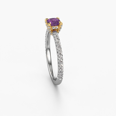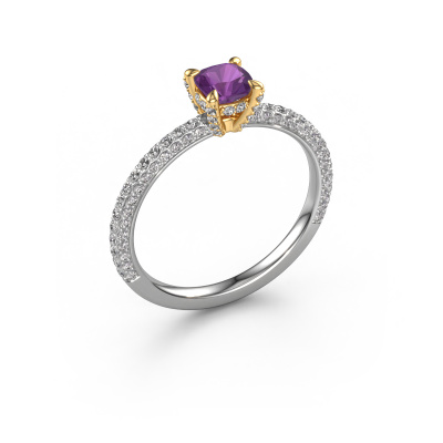 The ring shown above is called the Saskia 2 cus. We call this type of ring a pavé solitaire ring because it has one center gemstone and a band that is also pave set with gemstones. The 14 Carat white gold engagement ring is set with a cushion 4.5 mm amethyst center stone and the band is pave set with lab-grown diamond gemstones. Each jewel is made just for you, with attention to detail and design.This contemporary white gold pavé solitaire engagement ring has an exquisite cushion amethyst center stone. To further accentuate the center stone, the band is fully set with more lab grown diamonds. Its open prong setting allows light to strike the amethyst from various angles and this adds sparkle to your amethyst ring. The photo shown above depicts the goldsmith's carefully handcrafted details of the ring. The high positioning of the center stone is truly eye-catching. The perfect engagement ring for the crown jewel of your life! Are you on a budget? Please feel free to contact us, so we can go discuss your options. We offer our engagement rings at guaranteed best price, because we make them to order. You won't find such a price anywhere else!Our designers and goldsmiths work together each day, creating new jewels. Perhaps you have found a nice contemporary engagement ring somewhere, which can be used to customize your unique ring. Please feel free to contact us. We will make you an offer, based on a fair price/ quality ratio, which will amaze you.To make it easier for you, we offer a 30 day return policy. Check our terms and conditions.