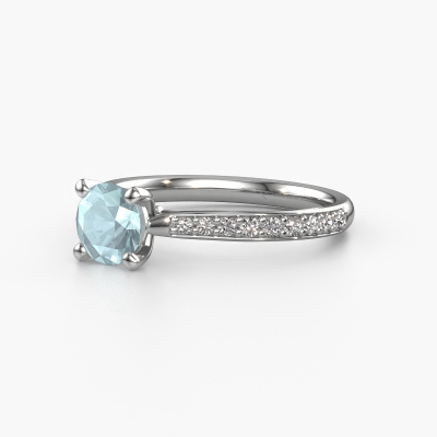 The ring shown above is called the Mignon rnd 2. We call this type of ring a pavé solitaire ring because it has one center gemstone and a band that is also pave set with gemstones. The platinum engagement ring is set with a round 6 mm aquamarine center stone and the band is pave set with lab-grown diamond gemstones. Each jewel is made by a team of passionate goldsmiths and jewel designers. This will make your crown jewel truly eye-catching.This luxury platinum pavé solitaire engagement ring has an exquisite round aquamarine center stone. To further accentuate the center stone, the band is fully set with more lab grown diamonds. Its open prong setting allows light to strike the aquamarine from various angles and this adds sparkle to your aquamarine ring. The photo shown above depicts the goldsmith's carefully handcrafted details of the ring. The high positioning of the center stone is truly eye-catching. The perfect engagement ring for the crown jewel of your life! By using our modern techniques, we can design and customize the finest quality jewels with the utmost care for you. Our engagement rings are always priced 30 percent lower than other jewelers. We make engagement rings to order so we don't have to maintain a large stock. If you have a certain budget, we are more than happy to advice you accordingly.Different styles of new rings are made daily by our team. Perhaps you have found a pavé solitaire engagement ring somewhere. One you would like to give to your loved one. Please feel free to share your thoughts and design with our jewel designers. We would love to turn your design into a luxury engagement ring. You can follow the development of your ring design because we use very detailed 3D drawings. On top of that, you can order a dummy of the design. A dummy is a plastic ring, which can be shaped according your ring design. You can try it on and check if the engagement ring is up to standard. We will gladly send you a non-binding offer, based on a fair price/ quality ratio. The offer will baffle you, considering the quality of the ring and gemstones.To make it easier for you, we offer a 30 day return policy. Check our terms and conditions.