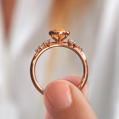 This 14 Carat rose gold ring is called Aliyah OVL and is set with citrin. Do you keep up with the latest fashion trends? Do you want a unique engagement ring that matches your lifestyle? This special engagement ring is an extraordinary ring which can be custom made to fit your or her personal style. This modern rose gold engagement ring is set with citrin. Our citrin are carefully selected for this specific ring in order to create the best effect. Our expert goldsmith will create your ring in our own artisan studio where the citrin will be set with great care. The ring will then be polished to perfection. Nothing but the best for the love of your life! This jewel is made by a team of passionate goldsmiths and jewel designers. This will make your crown jewel truly eye-catching.By using a combination of the latest modern techniques, combined with ancient crafting, we can make all our engagement rings in our own studio. Each jewel is made to order. This is advantageous because we can offer you a price you won't find anywhere else.Different styles of new rings are made daily by our team. Perhaps you have found a bezel set engagement ring somewhere. One you would like to give to your loved one. Please feel free to share your thoughts and design with our jewel designers. We would love to turn your design into a modern engagement ring. You can follow the development of your ring design because we use very detailed 3D drawings. On top of that, you can order a dummy of the design. A dummy is a plastic ring, which can be shaped according your ring design. You can try it on and check if the engagement ring is up to standard. We will gladly send you a non-binding offer, based on a fair price/ quality ratio. The offer will baffle you, considering the quality of the ring and gemstones.To make it easier for you, we offer a 30 day return policy. Check our terms and conditions.