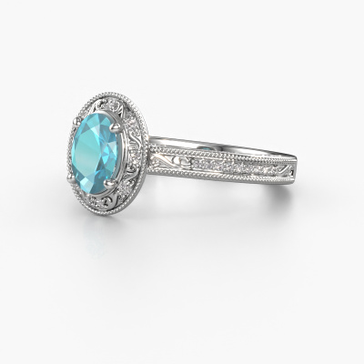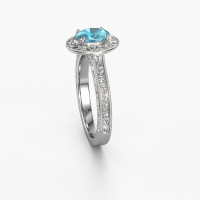 This platinum ring is called Alice OVL and is set with 7x5 mm blue topaz. What is it that makes your relationship unique? What is it about her that makes you want to bend down on one knee? The unique bond between the two of you is emphasized by an equally unique ring. A one of a kind filigree halo engagement ring made especially for her. That is why this vintage ring fits her like a glove. Each specific detail of this filigree platinum blue topaz set engagement ring is hand-picked, crafted and polished by our expert goldsmith. The result is an exquisite ring, unique and perfectly crafted to perfection. That is what our expert Goldsmiths strive for. This jewel is made with passion and love by one of our master goldsmiths.By using our modern techniques, we can design and customize the finest quality jewels with the utmost care for you. Our engagement rings are always priced 30 percent lower than other jewelers. We make engagement rings to order so we don't have to maintain a large stock. If you have a certain budget, we are more than happy to advice you accordingly.Our team adds new designs to our online collection daily. Our designers and goldsmiths work together in creating the best design. We strive to offer a diverse collection of jewels. Perhaps you have a specific jewel design in mind. One you came across somewhere. Please contact us for a free consultation. We will make you an offer, based on a fair price/ quality ratio, that will baffle you.To make it easier for you, we offer a 30 day return policy. Check our terms and conditions.