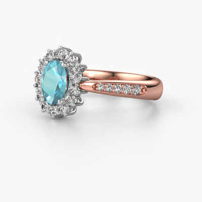 The ring shown above is called the Margien 2. We call this a Lady Diana ring. With an Lady Diana engagement ring, the larger center gem is encircled by smaller side stones. This 14 Carat rose gold ring is set with a 7x5 mm oval blue topaz gemstone, surrounded by smaller diamonds side stones. It's the most famous and celebrated engagement ring in the world; The Lady Diana ring. Exclusively meant for the most remarkable person in your life! A truly stunning aspect of this Lady Diana ring is its center blue topaz. The smaller side stones embracing the blue topaz emphasize the sparkle of the center gemstone, this makes it look as though they merge into one big gemstone. Due to its design, this is even more apparent in the Lady Di ring. Our expert Goldsmiths are keen to create a unique ring just for you. We can even customize the ring to your liking in our own crafting studio. This piece of jewelry is created to add sparkle to your finger, each jewel is lovingly made by hand by our goldsmiths.Are you on a budget? Please feel free to contact us, so we can go discuss your options. We offer our engagement rings at guaranteed best price, because we make them to order. You won't find such a price anywhere else!Our team adds new designs to our online collection daily. Our designers and goldsmiths work together in creating the best design. We strive to offer a diverse collection of jewels. Perhaps you have a specific jewel design in mind. One you came across somewhere. Please contact us for a free consultation. We will make you an offer, based on a fair price/ quality ratio, that will baffle you.To make it easier for you, we offer a 30 day return policy. Check our terms and conditions.