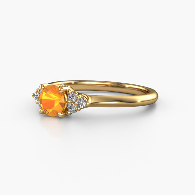 This 14 Carat gold ring is called Felipa RND and is set with 5 mm citrin. What is it that makes your relationship unique? What is it about her that makes you want to bend down on one knee? The unique bond between the two of you is emphasized by an equally unique ring. A one of a kind ajour 3-stone engagement ring made especially for her. That is why this fantasy ring fits her like a glove. Each specific detail of this ajour gold citrin set engagement ring is hand-picked, crafted and polished by our expert goldsmith. The result is an exquisite ring, unique and perfectly crafted to perfection. That is what our expert Goldsmiths strive for. This jewel is made just for you by our master goldsmiths in our own studio.After receiving your order, our goldsmiths will passionately start the creative process of making your engagement ring in our own studio. Because we don't have a big stockpile, these costs will not be passed on to you. Our pricing is proof of that! We offer top quality jewels at lowest price, guaranteed.Have you found a specific engagement ring somewhere which you would like to give to your loved one? Please feel free to express your wishes to our jewel designers because we would be honored to turn your design into a fantasy engagement ring. You can follow the development of your ring design because we use 3D drawings. This gives you a realistic preview of how your design will look. You can also preorder a dummy. A dummy is a plastic ring, which can be shaped according your ring design. You can try it on and check if its width and size are suitable for you. We will gladly send you a non-binding offer, based on a fair price/ quality ratio. It will amaze you, considering the quality of the ring and gemstones.To make it easier for you, we offer a 30 day return policy. Check our terms and conditions.