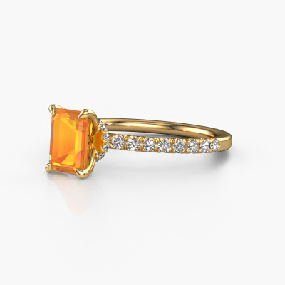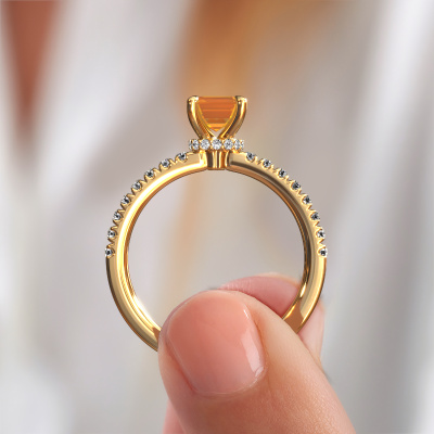 The ring shown above is called the Crystal EME 4. We call this type of ring a pavé solitaire ring because it has one center gemstone and a band that is also pave set with gemstones. The 14 Carat gold engagement ring is set with a emerald cut 7x5 mm citrin center stone and the band is pave set with lab-grown diamond gemstones. Each jewel is created to add sparkle to your finger, each jewel is lovingly made by hand by our goldsmiths.This fashionable gold pavé solitaire engagement ring has an exquisite emerald cut citrin center stone. To further accentuate the center stone, the band is fully set with more lab grown diamonds. Its open prong setting allows light to strike the citrin from various angles and this adds sparkle to your citrin ring. The photo shown above depicts the goldsmith's carefully handcrafted details of the ring. The high positioning of the center stone is truly eye-catching. The perfect engagement ring for the crown jewel of your life! After receiving your order, our goldsmiths will passionately start the creative process of making your engagement ring in our own studio. Because we don't have a big stockpile, these costs will not be passed on to you. Our pricing is proof of that! We offer top quality jewels at lowest price, guaranteed.Our team adds new designs to our online collection daily. Our designers and goldsmiths work together in creating the best design. We strive to offer a diverse collection of jewels. Perhaps you have a specific jewel design in mind. One you came across somewhere. Please contact us for a free consultation. We will make you an offer, based on a fair price/ quality ratio, that will baffle you.To make it easier for you, we offer a 30 day return policy. Check our terms and conditions.