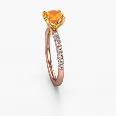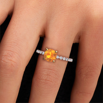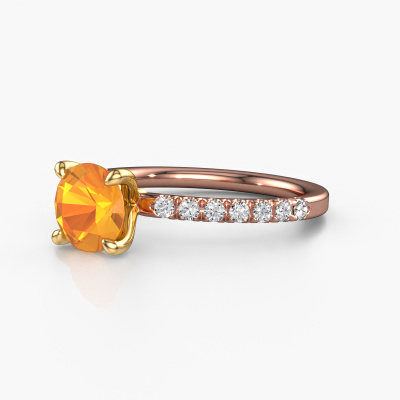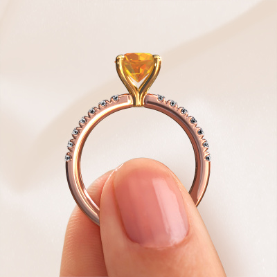 The ring shown above is called the Crystal RND 2. We call this type of ring a pavé solitaire ring because it has one center gemstone and a band that is also pave set with gemstones. The 14 Carat rose gold engagement ring is set with a round 7 mm citrin center stone and the band is pave set with lab-grown diamond gemstones. Each jewel is unique in every way! Simply customize to your liking,This classic rose gold pavé solitaire engagement ring has an exquisite round citrin center stone. To further accentuate the center stone, the band is fully set with more lab grown diamonds. Its open prong setting allows light to strike the citrin from various angles and this adds sparkle to your citrin ring. The photo shown above depicts the goldsmith's carefully handcrafted details of the ring. The high positioning of the center stone is truly eye-catching. The perfect engagement ring for the crown jewel of your life! After receiving your order, our goldsmiths will start the creative process of making your Crystal RND 2 engagement ring. We don't keep stock. This is advantageous because these costs will not be passed on to you. Therefore, we can offer jewelry at exceptionally low prices.Different styles of new rings are made daily by our team. Perhaps you have found a pavé solitaire engagement ring somewhere. One you would like to give to your loved one. Please feel free to share your thoughts and design with our jewel designers. We would love to turn your design into a classic engagement ring. You can follow the development of your ring design because we use very detailed 3D drawings. On top of that, you can order a dummy of the design. A dummy is a plastic ring, which can be shaped according your ring design. You can try it on and check if the engagement ring is up to standard. We will gladly send you a non-binding offer, based on a fair price/ quality ratio. The offer will baffle you, considering the quality of the ring and gemstones.To make it easier for you, we offer a 30 day return policy. Check our terms and conditions.