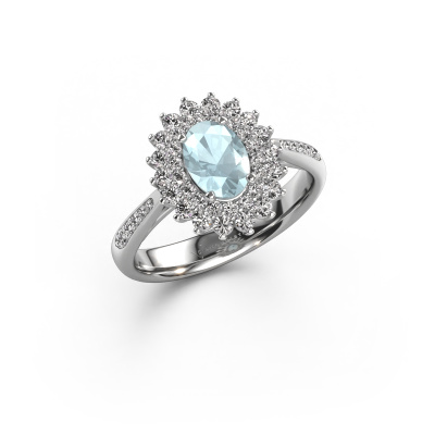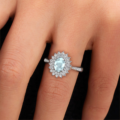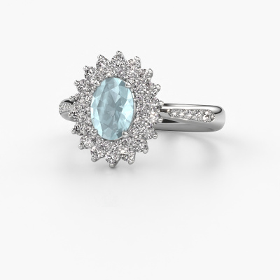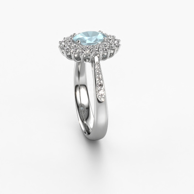 The ring shown above is called the Alina 2. We call this type of ring a cluster ring. The center gemstone is surrounded by smaller sized stones. This 14 Carat white gold version is set with a 7x5 mm oval aquamarine center stone, embraced by smaller diamonds. What makes this exclusive white gold cluster ring special is the setting of the smaller gems surrounding the center aquamarine, which are shaped like a beautiful flower. The surrounding cluster of stones frame the middle center stone in such a way to make it appear bigger. This type of engagement ring is also called a flower ring. It is very important that the smaller diamonds are positioned identically so there is no interference of light but perfect unity instead. Our skilled Goldsmiths get the job done. Each individual stone is carefully set by hand. During manufacturing, light fall is constantly monitored to make sure the special cluster effect is still visible. In the end you get the perfect engagement ring with a radiant aquamarine gemstone centerpiece. You can imagine the effect of a ring of such significance when you give tot the love of your life on her special day to shine. This jewel is made just for you, with attention to detail and design.By using a combination of the latest modern techniques, combined with ancient crafting, we can make all our engagement rings in our own studio. Each jewel is made to order. This is advantageous because we can offer you a price you won't find anywhere else.Have you found a specific engagement ring somewhere which you would like to give to your loved one? Please feel free to express your wishes to our jewel designers because we would be honored to turn your design into a exclusive engagement ring. You can follow the development of your ring design because we use 3D drawings. This gives you a realistic preview of how your design will look. You can also preorder a dummy. A dummy is a plastic ring, which can be shaped according your ring design. You can try it on and check if its width and size are suitable for you. We will gladly send you a non-binding offer, based on a fair price/ quality ratio. It will amaze you, considering the quality of the ring and gemstones.To make it easier for you, we offer a 30 day return policy. Check our terms and conditions.