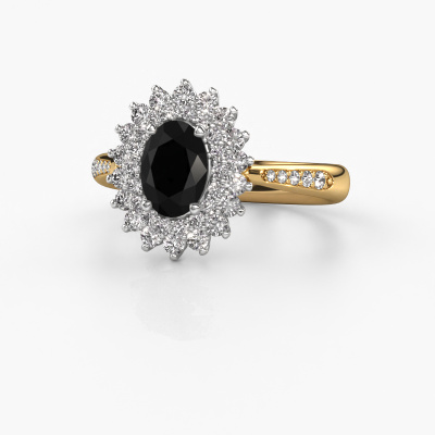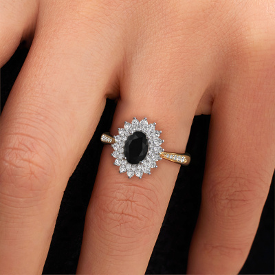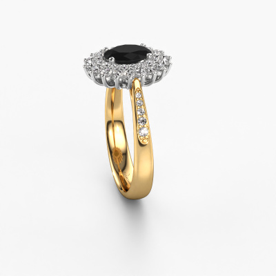 The ring shown above is called the Alina 2. We call this type of ring a cluster ring. The center gemstone is surrounded by smaller sized stones. This 14 Carat gold version is set with a 1.05 crt oval black diamond center stone, embraced by smaller diamonds. What makes this exclusive gold cluster ring special is the setting of the smaller gems surrounding the center black diamond, which are shaped like a beautiful flower. The surrounding cluster of stones frame the middle center stone in such a way to make it appear bigger. This type of engagement ring is also called a flower ring. It is very important that the smaller diamonds are positioned identically so there is no interference of light but perfect unity instead. Our skilled Goldsmiths get the job done. Each individual stone is carefully set by hand. During manufacturing, light fall is constantly monitored to make sure the special cluster effect is still visible. In the end you get the perfect engagement ring with a radiant black diamond gemstone centerpiece. You can imagine the effect of a ring of such significance when you give tot the love of your life on her special day to shine. This jewel is made just for you, with attention to detail and design.By using a combination of the latest modern techniques, combined with ancient crafting, we can make all our engagement rings in our own studio. Each jewel is made to order. This is advantageous because we can offer you a price you won't find anywhere else.Have you found a specific engagement ring somewhere which you would like to give to your loved one? Please feel free to express your wishes to our jewel designers because we would be honored to turn your design into a exclusive engagement ring. You can follow the development of your ring design because we use 3D drawings. This gives you a realistic preview of how your design will look. You can also preorder a dummy. A dummy is a plastic ring, which can be shaped according your ring design. You can try it on and check if its width and size are suitable for you. We will gladly send you a non-binding offer, based on a fair price/ quality ratio. It will amaze you, considering the quality of the ring and gemstones.To make it easier for you, we offer a 30 day return policy. Check our terms and conditions.
