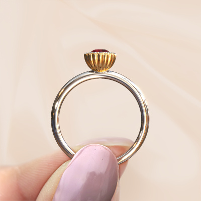 This 14 Carat white gold ring is called Queen and is set with 4.2 mm ruby. For you, there is only one person in your life who stands out in a crowd. Only one that makes your heart skip a beat. A true gem! She, above all others, deserves a special gift. A unique customized jewel made in her honor. We believe this ring is perfect for your special moment. Each detail of this exclusive white gold cluster engagement ring is selected by hand, crafted and polished by our expert goldsmith in our own artisan studio. We strive to achieve the perfect design and composition of the ring, so it enhances the unique features of our ruby, and lets them shine even brighter. It takes a lot of precision to make but in the end it pays off because of the sheer beauty of the ring. And that is our main goal. It's what gets us excited. The great thing about our online tool is, that you can design your own jewelry into a unique, personalized piece. This unique charming engagement ring is created with the precious metal combination of white gold and gold. But of course you are completely free to select other colors. Each piece of jewelry is made just for you by our master goldsmiths in our own studio.Are you on a budget? Please feel free to contact us, so we can go discuss your options. We offer our engagement rings at guaranteed best price, because we make them to order. You won't find such a price anywhere else!Our team adds new designs to our online collection daily. Our designers and goldsmiths work together in creating the best design. We strive to offer a diverse collection of jewels. Perhaps you have a specific jewel design in mind. One you came across somewhere. Please contact us for a free consultation. We will make you an offer, based on a fair price/ quality ratio, that will baffle you.To make it easier for you, we offer a 30 day return policy. Check our terms and conditions.
