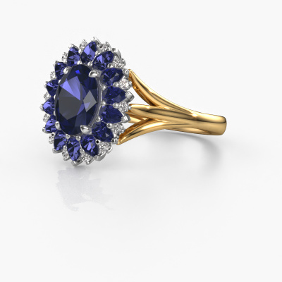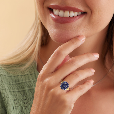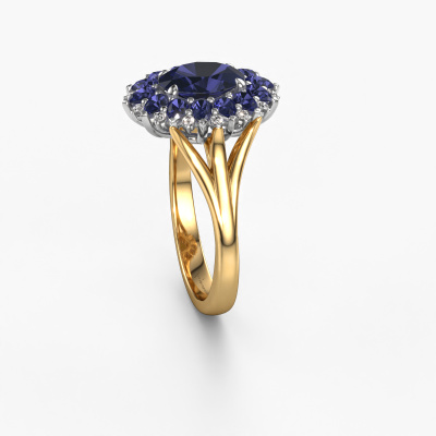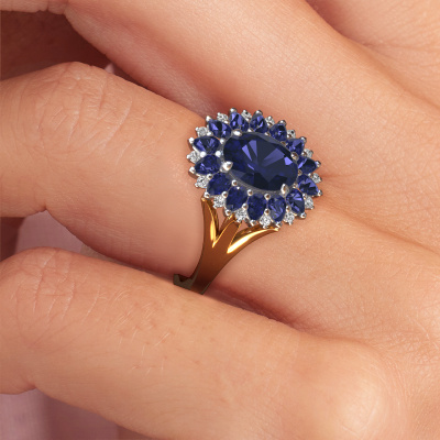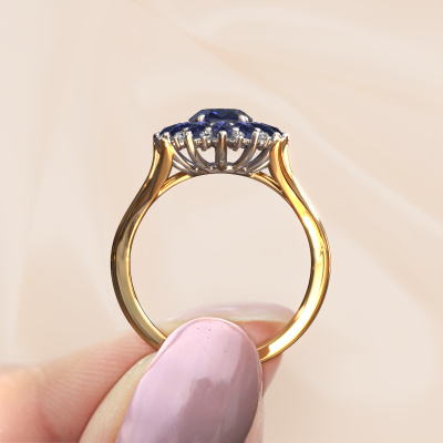 The ring shown above is called the Lidia. We call this type of ring a cluster ring. The center gemstone is surrounded by smaller sized stones. This 14 Carat gold version is set with a 8x6 mm oval sapphire center stone, embraced by smaller sapphire. What makes this vintage gold cluster ring special is the setting of the smaller gems surrounding the center sapphire, which are shaped like a beautiful flower. The surrounding cluster of stones frame the middle center stone in such a way to make it appear bigger. This type of engagement ring is also called a flower ring. It is very important that the smaller sapphire are positioned identically so there is no interference of light but perfect unity instead. Our skilled Goldsmiths get the job done. Each individual stone is carefully set by hand. During manufacturing, light fall is constantly monitored to make sure the special cluster effect is still visible. In the end you get the perfect engagement ring with a radiant sapphire gemstone centerpiece. You can imagine the effect of a ring of such significance when you give tot the love of your life on her special day to shine. This jewel is made with passion and love by one of our master goldsmiths.By using a combination of the latest modern techniques, combined with ancient crafting, we can make all our engagement rings in our own studio. Each jewel is made to order. This is advantageous because we can offer you a price you won't find anywhere else.Have you found a specific engagement ring somewhere which you would like to give to your loved one? Please feel free to express your wishes to our jewel designers because we would be honored to turn your design into a vintage engagement ring. You can follow the development of your ring design because we use 3D drawings. This gives you a realistic preview of how your design will look. You can also preorder a dummy. A dummy is a plastic ring, which can be shaped according your ring design. You can try it on and check if its width and size are suitable for you. We will gladly send you a non-binding offer, based on a fair price/ quality ratio. It will amaze you, considering the quality of the ring and gemstones.To make it easier for you, we offer a 30 day return policy. Check our terms and conditions.