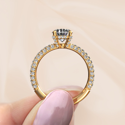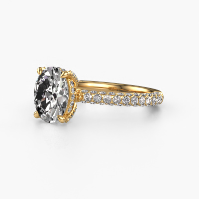 The ring shown above is called the Saskia 2 ovl. We call this type of ring a pavé solitaire ring because it has one center gemstone and a band that is also pave set with gemstones. The 14 Carat gold engagement ring is set with a oval 9x7 mm zirconia center stone and the band is pave set with lab-grown diamond gemstones. Each jewel is made just for you by our master goldsmiths in our own studio.This exclusive gold pavé solitaire engagement ring has an exquisite oval zirconia center stone. To further accentuate the center stone, the band is fully set with more lab grown diamonds. Its open prong setting allows light to strike the zirconia from various angles and this adds sparkle to your zirconia ring. The photo shown above depicts the goldsmith's carefully handcrafted details of the ring. The high positioning of the center stone is truly eye-catching. The perfect engagement ring for the crown jewel of your life! After receiving your order, our goldsmiths will passionately start the creative process of making your engagement ring in our own studio. Because we don't have a big stockpile, these costs will not be passed on to you. Our pricing is proof of that! We offer top quality jewels at lowest price, guaranteed.Have you found a specific engagement ring somewhere which you would like to give to your loved one? Please feel free to express your wishes to our jewel designers because we would be honored to turn your design into a exclusive engagement ring. You can follow the development of your ring design because we use 3D drawings. This gives you a realistic preview of how your design will look. You can also preorder a dummy. A dummy is a plastic ring, which can be shaped according your ring design. You can try it on and check if its width and size are suitable for you. We will gladly send you a non-binding offer, based on a fair price/ quality ratio. It will amaze you, considering the quality of the ring and gemstones.To make it easier for you, we offer a 30 day return policy. Check our terms and conditions.