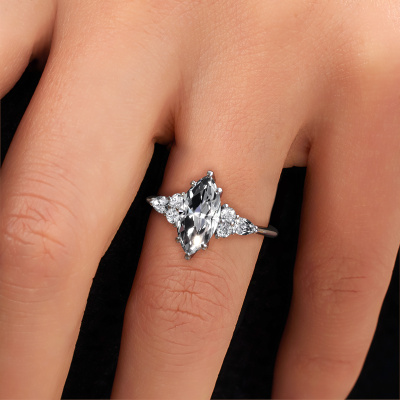 This platinum ring is called Melani MRQ and is set with 2.72 crt diamond. What is it that makes your relationship unique? What is it about her that makes you want to bend down on one knee? The unique bond between the two of you is emphasized by an equally unique ring. A one of a kind graceful cluster engagement ring made especially for her. That is why this trendy ring fits her like a glove. Each specific detail of this graceful platinum diamond set engagement ring is hand-picked, crafted and polished by our expert goldsmith. The result is an exquisite ring, unique and perfectly crafted to perfection. That is what our expert Goldsmiths strive for. This jewel is made just for you, with attention to detail and design.After receiving your order, our goldsmiths will passionately start the creative process of making your engagement ring in our own studio. Because we don't have a big stockpile, these costs will not be passed on to you. Our pricing is proof of that! We offer top quality jewels at lowest price, guaranteed.Do you have a specific ring in mind? One you came across somewhere. Please feel free to tell us your wishes and we will turn your design into a unique engagement ring. You can follow the development of your ring design because we use 3D drawings. This gives you a realistic preview of your design. We will gladly send you a non-binding offer, based on a fair price/ quality ratio. It will amaze you.To make it easier for you, we offer a 30 day return policy. Check our terms and conditions.