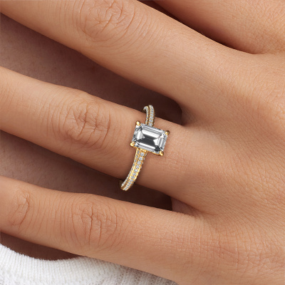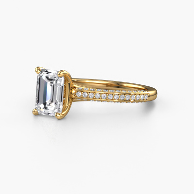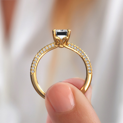 The ring shown above is called the Elenore eme. We call this type of ring a pavé solitaire ring because it has one center gemstone and a band that is also pave set with gemstones. This engagement ring is made in 14 Carat gold set with a 1.50 crt emerald cut diamond, and pave set lab grown diamonds at the sides. Each piece of jewelry is made just for you, with attention to detail and design.This exclusive gold pavé solitaire engagement ring has an exquisite emerald cut diamond center stone. To further accentuate the center stone, the band is set full with more lab grown diamonds. Its open prong setting allows light to strike the diamond from various angles and this adds sparkle to your diamond ring. The photo shown above depicts the goldsmith's carefully handcrafted details of the ring. The high positioning of the center stone is truly eye-catching. The perfect engagement ring for the crown jewel of your life!Are you on a budget? Please feel free to contact us, so we can go discuss your options. We offer our engagement rings at guaranteed best price, because we make them to order. You won't find such a price anywhere else!Have you found a specific engagement ring somewhere which you would like to give to your loved one? Please feel free to express your wishes to our jewel designers because we would be honored to turn your design into a exclusive engagement ring. You can follow the development of your ring design because we use 3D drawings. This gives you a realistic preview of how your design will look. You can also preorder a dummy. A dummy is a plastic ring, which can be shaped according your ring design. You can try it on and check if its width and size are suitable for you. We will gladly send you a non-binding offer, based on a fair price/ quality ratio. It will amaze you, considering the quality of the ring and gemstones.To make it easier for you, we offer a 30 day return policy. Check our terms and conditions.