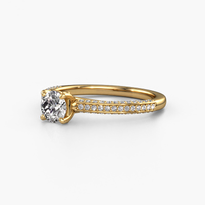 The ring shown above is called the Elenore rnd. We call this type of ring a pavé solitaire ring because it has one center gemstone and a band that is also pave set with gemstones. This engagement ring is made in 14 Carat gold set with a 0.50 crt round diamond, and pave set lab grown diamonds at the sides. Each piece of jewelry is made just for you by our master goldsmiths in our own studio.This exclusive gold pavé solitaire engagement ring has an exquisite round diamond center stone. To further accentuate the center stone, the band is set full with more lab grown diamonds. Its open prong setting allows light to strike the diamond from various angles and this adds sparkle to your diamond ring. The photo shown above depicts the goldsmith's carefully handcrafted details of the ring. The high positioning of the center stone is truly eye-catching. The perfect engagement ring for the crown jewel of your life!By using a combination of the latest modern techniques, combined with ancient crafting, we can make all our engagement rings in our own studio. Each jewel is made to order. This is advantageous because we can offer you a price you won't find anywhere else.Have you found a specific engagement ring somewhere which you would like to give to your loved one? Please feel free to express your wishes to our jewel designers because we would be honored to turn your design into a exclusive engagement ring. You can follow the development of your ring design because we use 3D drawings. This gives you a realistic preview of how your design will look. You can also preorder a dummy. A dummy is a plastic ring, which can be shaped according your ring design. You can try it on and check if its width and size are suitable for you. We will gladly send you a non-binding offer, based on a fair price/ quality ratio. It will amaze you, considering the quality of the ring and gemstones.To make it easier for you, we offer a 30 day return policy. Check our terms and conditions.