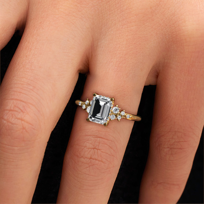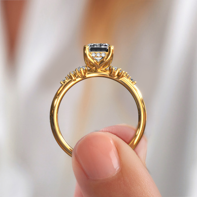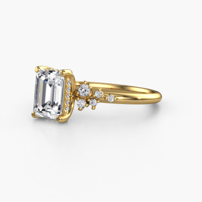 The ring shown above is called the Emma EME. We call this type of ring a pavé solitaire ring because it has one center gemstone and a band that is also pave set with gemstones. This engagement ring is made in 14 Carat gold set with a 1.50 crt emerald cut diamond, and pave set lab grown diamonds at the sides. Each piece of jewelry is made with passion and love by one of our master goldsmiths.This fantasy gold pavé solitaire engagement ring has an exquisite emerald cut diamond center stone. To further accentuate the center stone, the band is set full with more lab grown diamonds. Its open prong setting allows light to strike the diamond from various angles and this adds sparkle to your diamond ring. The photo shown above depicts the goldsmith's carefully handcrafted details of the ring. The high positioning of the center stone is truly eye-catching. The perfect engagement ring for the crown jewel of your life!After receiving your order, our goldsmiths will passionately start the creative process of making your engagement ring in our own studio. Because we don't have a big stockpile, these costs will not be passed on to you. Our pricing is proof of that! We offer top quality jewels at lowest price, guaranteed.Our team adds new designs to our online collection daily. Our designers and goldsmiths work together in creating the best design. We strive to offer a diverse collection of jewels. Perhaps you have a specific jewel design in mind. One you came across somewhere. Please contact us for a free consultation. We will make you an offer, based on a fair price/ quality ratio, that will baffle you.To make it easier for you, we offer a 30 day return policy. Check our terms and conditions.