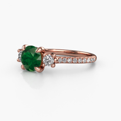This 14 Carat rose gold ring is called Jesica and is set with 6.8 mm emerald. What is it that makes your relationship unique? What is it about her that makes you want to bend down on one knee? The unique bond between the two of you is emphasized by an equally unique ring. A one of a kind graceful 3-stone engagement ring made especially for her. That is why this classic ring fits her like a glove. Each specific detail of this graceful rose gold emerald set engagement ring is hand-picked, crafted and polished by our expert goldsmith. The result is an exquisite ring, unique and perfectly crafted to perfection. That is what our expert Goldsmiths strive for. This jewel is made just for you, with attention to detail and design.After receiving your order, our goldsmiths will passionately start the creative process of making your engagement ring in our own studio. Because we don't have a big stockpile, these costs will not be passed on to you. Our pricing is proof of that! We offer top quality jewels at lowest price, guaranteed.Different styles of new rings are made daily by our team. Perhaps you have found a 3-stone engagement ring somewhere. One you would like to give to your loved one. Please feel free to share your thoughts and design with our jewel designers. We would love to turn your design into a classic engagement ring. You can follow the development of your ring design because we use very detailed 3D drawings. On top of that, you can order a dummy of the design. A dummy is a plastic ring, which can be shaped according your ring design. You can try it on and check if the engagement ring is up to standard. We will gladly send you a non-binding offer, based on a fair price/ quality ratio. The offer will baffle you, considering the quality of the ring and gemstones.To make it easier for you, we offer a 30 day return policy. Check our terms and conditions.