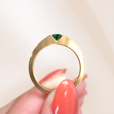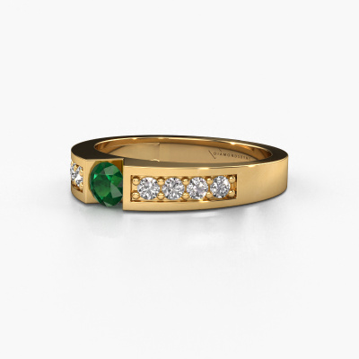 The ring shown above is called the Lizzy 2. We call this type of ring a pavé solitaire ring because it has one center gemstone and a band that is also pave set with gemstones. This engagement ring is made in 14 Carat gold set with a 4.2 mm round emerald, and pave set diamonds at the sides. Each piece of jewelry is made to shine bright around your finger. Each jewel is hand made with love by our goldsmiths.This modern gold pavé solitaire engagement ring has an exquisite round emerald center stone. To further accentuate the center stone, the band is set full with more diamonds. Its open prong setting allows light to strike the emerald from various angles and this adds sparkle to your emerald ring. The photo shown above depicts the goldsmith's carefully handcrafted details of the ring. The high positioning of the center stone is truly eye-catching. The perfect engagement ring for the crown jewel of your life!By using a combination of the latest modern techniques, combined with ancient crafting, we can make all our engagement rings in our own studio. Each jewel is made to order. This is advantageous because we can offer you a price you won't find anywhere else.Our team adds new designs to our online collection daily. Our designers and goldsmiths work together in creating the best design. We strive to offer a diverse collection of jewels. Perhaps you have a specific jewel design in mind. One you came across somewhere. Please contact us for a free consultation. We will make you an offer, based on a fair price/ quality ratio, that will baffle you.To make it easier for you, we offer a 30 day return policy. Check our terms and conditions.