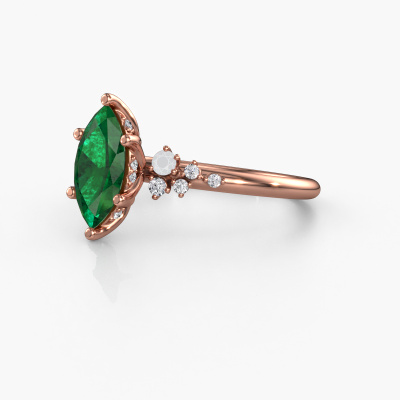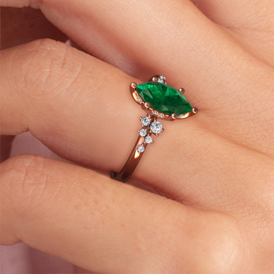 This 14 Carat rose gold ring is called Emma MRQ and is set with emerald. How would you describe the style of the love of your life? Does she have a unique sense of style? This stunning special rose gold engagement ring can be custom made to your own or her liking. Our emeralds gemstones have been carefully selected because we believe your trendy engagement ring must be adorned with nothing but the most beautiful gemstone. Don't you agree? This jewel is made just for you, with attention to detail and design.After receiving your order, our goldsmiths will passionately start the creative process of making your engagement ring in our own studio. Because we don't have a big stockpile, these costs will not be passed on to you. Our pricing is proof of that! We offer top quality jewels at lowest price, guaranteed.Do you have a specific ring in mind? One you came across somewhere. Please feel free to tell us your wishes and we will turn your design into a unique engagement ring. You can follow the development of your ring design because we use 3D drawings. This gives you a realistic preview of your design. We will gladly send you a non-binding offer, based on a fair price/ quality ratio. It will amaze you.To make it easier for you, we offer a 30 day return policy. Check our terms and conditions.