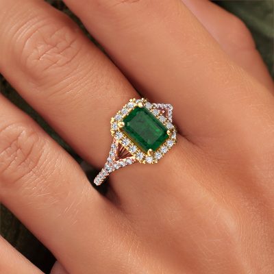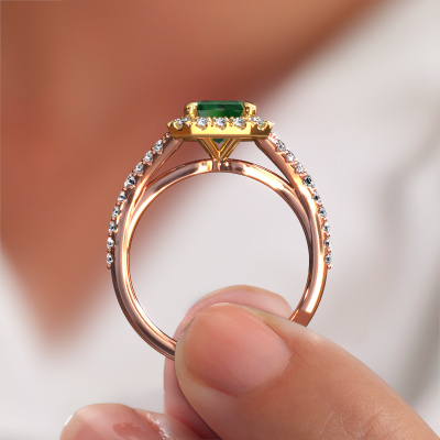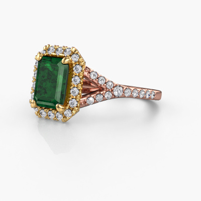 The ring shown above is called the Kimber EME. We call this type of ring a pavé solitaire ring because it has one center gemstone and a band that is also pave set with gemstones. The 14 Carat rose gold engagement ring is set with a emerald cut 8x6 mm emerald center stone and the band is pave set with lab-grown diamond gemstones. Each jewel is made by a team of passionate goldsmiths and jewel designers. This will make your crown jewel truly eye-catching.This exclusive rose gold pavé solitaire engagement ring has an exquisite emerald cut emerald center stone. To further accentuate the center stone, the band is fully set with more lab grown diamonds. Its open prong setting allows light to strike the emerald from various angles and this adds sparkle to your emerald ring. The photo shown above depicts the goldsmith's carefully handcrafted details of the ring. The high positioning of the center stone is truly eye-catching. The perfect engagement ring for the crown jewel of your life! By using a combination of the latest modern techniques, combined with ancient crafting, we can make all our engagement rings in our own studio. Each jewel is made to order. This is advantageous because we can offer you a price you won't find anywhere else.Our team adds new designs to our online collection daily. Our designers and goldsmiths work together in creating the best design. We strive to offer a diverse collection of jewels. Perhaps you have a specific jewel design in mind. One you came across somewhere. Please contact us for a free consultation. We will make you an offer, based on a fair price/ quality ratio, that will baffle you.To make it easier for you, we offer a 30 day return policy. Check our terms and conditions.