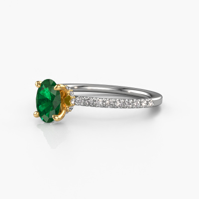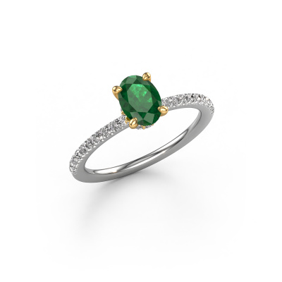 The ring shown above is called the Crystal OVL 4. We call this type of ring a pavé solitaire ring because it has one center gemstone and a band that is also pave set with gemstones. The 14 Carat white gold engagement ring is set with a oval 7x5 mm emerald center stone and the band is pave set with diamond gemstones. Each jewel is made with passion and love by one of our master goldsmiths.This contemporary white gold pavé solitaire engagement ring has an exquisite oval emerald center stone. To further accentuate the center stone, the band is fully set with more diamonds. Its open prong setting allows light to strike the emerald from various angles and this adds sparkle to your emerald ring. The photo shown above depicts the goldsmith's carefully handcrafted details of the ring. The high positioning of the center stone is truly eye-catching. The perfect engagement ring for the crown jewel of your life! After receiving your order, our goldsmiths will passionately start the creative process of making your engagement ring in our own studio. Because we don't have a big stockpile, these costs will not be passed on to you. Our pricing is proof of that! We offer top quality jewels at lowest price, guaranteed.Our team adds new designs to our online collection daily. Our designers and goldsmiths work together in creating the best design. We strive to offer a diverse collection of jewels. Perhaps you have a specific jewel design in mind. One you came across somewhere. Please contact us for a free consultation. We will make you an offer, based on a fair price/ quality ratio, that will baffle you.To make it easier for you, we offer a 30 day return policy. Check our terms and conditions.