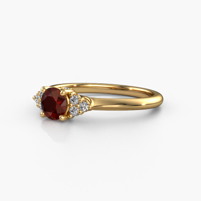 This 14 Carat gold ring is called Felipa RND and is set with 5 mm garnet. What is it that makes your relationship unique? What is it about her that makes you want to bend down on one knee? The unique bond between the two of you is emphasized by an equally unique ring. A one of a kind ajour 3-stone engagement ring made especially for her. That is why this fantasy ring fits her like a glove. Each specific detail of this ajour gold garnet set engagement ring is hand-picked, crafted and polished by our expert goldsmith. The result is an exquisite ring, unique and perfectly crafted to perfection. That is what our expert Goldsmiths strive for. This jewel is made just for you by our master goldsmiths in our own studio.After receiving your order, our goldsmiths will passionately start the creative process of making your engagement ring in our own studio. Because we don't have a big stockpile, these costs will not be passed on to you. Our pricing is proof of that! We offer top quality jewels at lowest price, guaranteed.Have you found a specific engagement ring somewhere which you would like to give to your loved one? Please feel free to express your wishes to our jewel designers because we would be honored to turn your design into a fantasy engagement ring. You can follow the development of your ring design because we use 3D drawings. This gives you a realistic preview of how your design will look. You can also preorder a dummy. A dummy is a plastic ring, which can be shaped according your ring design. You can try it on and check if its width and size are suitable for you. We will gladly send you a non-binding offer, based on a fair price/ quality ratio. It will amaze you, considering the quality of the ring and gemstones.To make it easier for you, we offer a 30 day return policy. Check our terms and conditions.