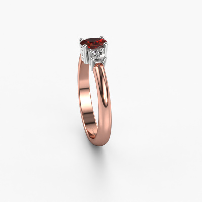 This 14 Carat rose gold ring is called Karie and is set with garnet. How would you describe the style of the love of your life? Does she have a unique sense of style? This stunning ajour rose gold engagement ring can be custom made to your own or her liking. Our garnet gemstones have been carefully selected because we believe your traditional engagement ring must be adorned with nothing but the most beautiful gemstone. Don't you agree? This jewel is made just for you by our master goldsmiths in our own studio.After receiving your order, our goldsmiths will passionately start the creative process of making your engagement ring in our own studio. Because we don't have a big stockpile, these costs will not be passed on to you. Our pricing is proof of that! We offer top quality jewels at lowest price, guaranteed.Do you have a specific ring in mind? One you came across somewhere. Please feel free to tell us your wishes and we will turn your design into a unique engagement ring. You can follow the development of your ring design because we use 3D drawings. This gives you a realistic preview of your design. We will gladly send you a non-binding offer, based on a fair price/ quality ratio. It will amaze you.To make it easier for you, we offer a 30 day return policy. Check our terms and conditions.