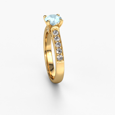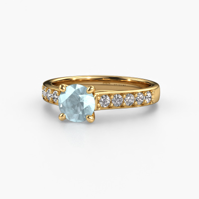 The ring shown above is called the Valorie RND 2. We call this type of ring a pavé solitaire ring because it has one center gemstone and a band that is also pave set with gemstones. The 14 Carat gold engagement ring is set with a round 6.5 mm aquamarine center stone and the band is pave set with lab-grown diamond gemstones. Each jewel is made just for you, with attention to detail and design.This modern gold pavé solitaire engagement ring has an exquisite round aquamarine center stone. To further accentuate the center stone, the band is fully set with more lab grown diamonds. Its open prong setting allows light to strike the aquamarine from various angles and this adds sparkle to your aquamarine ring. The photo shown above depicts the goldsmith's carefully handcrafted details of the ring. The high positioning of the center stone is truly eye-catching. The perfect engagement ring for the crown jewel of your life! By using our modern techniques, we can design and customize the finest quality jewels with the utmost care for you. Our engagement rings are always priced 30 percent lower than other jewelers. We make engagement rings to order so we don't have to maintain a large stock. If you have a certain budget, we are more than happy to advice you accordingly.Our designers and goldsmiths work together each day, creating new jewels. Perhaps you have found a nice modern engagement ring somewhere, which can be used to customize your unique ring. Please feel free to contact us. We will make you an offer, based on a fair price/ quality ratio, which will amaze you.To make it easier for you, we offer a 30 day return policy. Check our terms and conditions.