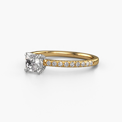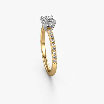 The ring shown above is called the Saskia 1 cus. We call this type of ring a pavé solitaire ring because it has one center gemstone and a band that is also pave set with gemstones. The 14 Carat gold engagement ring is set with a cushion 0.50 crt diamond center stone and the band is pave set with diamond gemstones. Each jewel is made by a team of passionate goldsmiths and jewel designers. This will make your crown jewel truly eye-catching.This unique gold pavé solitaire engagement ring has an exquisite cushion diamond center stone. To further accentuate the center stone, the band is fully set with more diamonds. Its open prong setting allows light to strike the diamond from various angles and this adds sparkle to your diamond ring. The photo shown above depicts the goldsmith's carefully handcrafted details of the ring. The high positioning of the center stone is truly eye-catching. The perfect engagement ring for the crown jewel of your life! By using a combination of the latest modern techniques, combined with ancient crafting, we can make all our engagement rings in our own studio. Each jewel is made to order. This is advantageous because we can offer you a price you won't find anywhere else.Our team adds new designs to our online collection daily. Our designers and goldsmiths work together in creating the best design. We strive to offer a diverse collection of jewels. Perhaps you have a specific jewel design in mind. One you came across somewhere. Please contact us for a free consultation. We will make you an offer, based on a fair price/ quality ratio, that will baffle you.To make it easier for you, we offer a 30 day return policy. Check our terms and conditions.