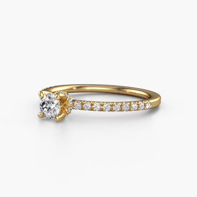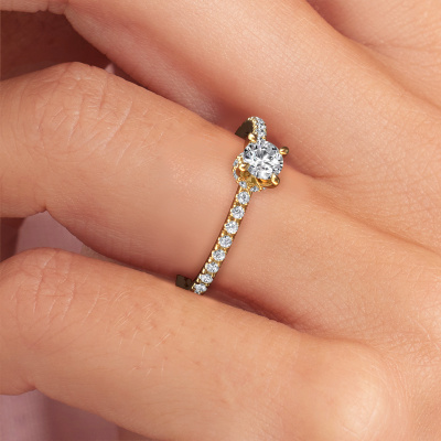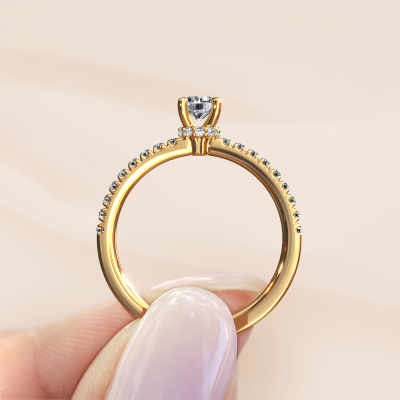 The ring shown above is called the Crystal rnd 4. We call this type of ring a pavé solitaire ring because it has one center gemstone and a band that is also pave set with gemstones. The 14 Carat gold engagement ring is set with a round 0.25 crt diamond center stone and the band is pave set with lab-grown diamond gemstones. Each jewel is made to shine bright around your finger. Each jewel is hand made with love by our goldsmiths.This fantasy gold pavé solitaire engagement ring has an exquisite round diamond center stone. To further accentuate the center stone, the band is fully set with more lab grown diamonds. Its open prong setting allows light to strike the diamond from various angles and this adds sparkle to your diamond ring. The photo shown above depicts the goldsmith's carefully handcrafted details of the ring. The high positioning of the center stone is truly eye-catching. The perfect engagement ring for the crown jewel of your life! By using our modern techniques, we can design and customize the finest quality jewels with the utmost care for you. Our engagement rings are always priced 30 percent lower than other jewelers. We make engagement rings to order so we don't have to maintain a large stock. If you have a certain budget, we are more than happy to advice you accordingly.Have you found a specific engagement ring somewhere which you would like to give to your loved one? Please feel free to express your wishes to our jewel designers because we would be honored to turn your design into a fantasy engagement ring. You can follow the development of your ring design because we use 3D drawings. This gives you a realistic preview of how your design will look. You can also preorder a dummy. A dummy is a plastic ring, which can be shaped according your ring design. You can try it on and check if its width and size are suitable for you. We will gladly send you a non-binding offer, based on a fair price/ quality ratio. It will amaze you, considering the quality of the ring and gemstones.To make it easier for you, we offer a 30 day return policy. Check our terms and conditions.