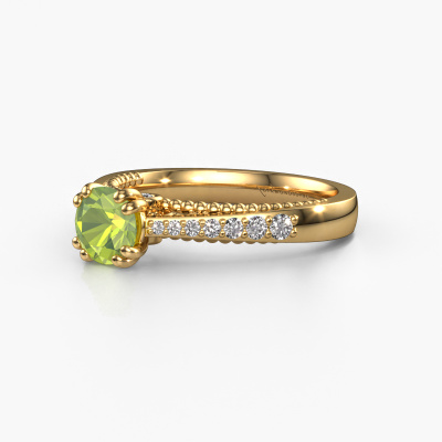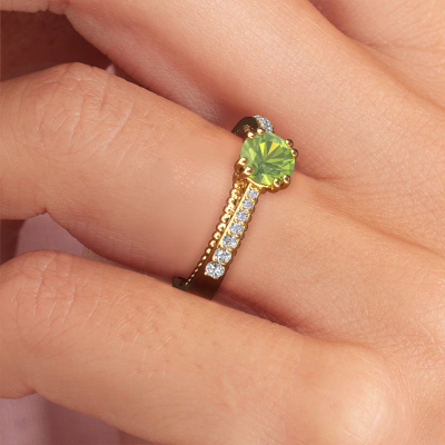 The ring shown above is called the Rozella. We call this type of ring a pavé solitaire ring because it has one center gemstone and a band that is also pave set with gemstones. The 14 Carat gold engagement ring is set with a round 5.5 mm peridot center stone and the band is pave set with lab-grown diamond gemstones. Each jewel is made to shine bright around your finger. Each jewel is hand made with love by our goldsmiths.This unique gold pavé solitaire engagement ring has an exquisite round peridot center stone. To further accentuate the center stone, the band is fully set with more lab grown diamonds. Its open prong setting allows light to strike the peridot from various angles and this adds sparkle to your peridot ring. The photo shown above depicts the goldsmith's carefully handcrafted details of the ring. The high positioning of the center stone is truly eye-catching. The perfect engagement ring for the crown jewel of your life! After receiving your order, our goldsmiths will start the creative process of making your Rozella engagement ring. We don't keep stock. This is advantageous because these costs will not be passed on to you. Therefore, we can offer jewelry at exceptionally low prices.Our designers and goldsmiths work together each day, creating new jewels. Perhaps you have found a nice unique engagement ring somewhere, which can be used to customize your unique ring. Please feel free to contact us. We will make you an offer, based on a fair price/ quality ratio, which will amaze you.To make it easier for you, we offer a 30 day return policy. Check our terms and conditions.