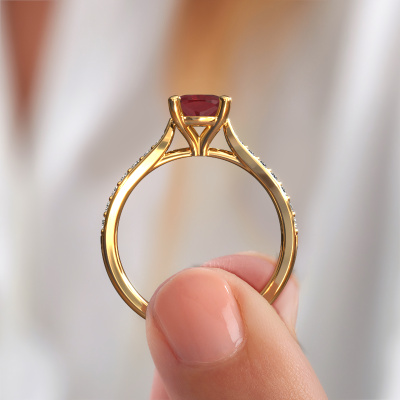 The ring shown above is called the Mignon cus 2. We call this type of ring a pavé solitaire ring because it has one center gemstone and a band that is also pave set with gemstones. The 14 Carat gold engagement ring is set with a cushion 6 mm ruby center stone and the band is pave set with lab-grown diamond gemstones. Each jewel is made with passion and love by one of our master goldsmiths.This exclusive gold pavé solitaire engagement ring has an exquisite cushion ruby center stone. To further accentuate the center stone, the band is fully set with more lab grown diamonds. Its open prong setting allows light to strike the ruby from various angles and this adds sparkle to your ruby ring. The photo shown above depicts the goldsmith's carefully handcrafted details of the ring. The high positioning of the center stone is truly eye-catching. The perfect engagement ring for the crown jewel of your life! After receiving your order, our goldsmiths will start the creative process of making your Mignon cus 2 engagement ring. We don't keep stock. This is advantageous because these costs will not be passed on to you. Therefore, we can offer jewelry at exceptionally low prices.Our team adds new designs to our online collection daily. Our designers and goldsmiths work together in creating the best design. We strive to offer a diverse collection of jewels. Perhaps you have a specific jewel design in mind. One you came across somewhere. Please contact us for a free consultation. We will make you an offer, based on a fair price/ quality ratio, that will baffle you.To make it easier for you, we offer a 30 day return policy. Check our terms and conditions.