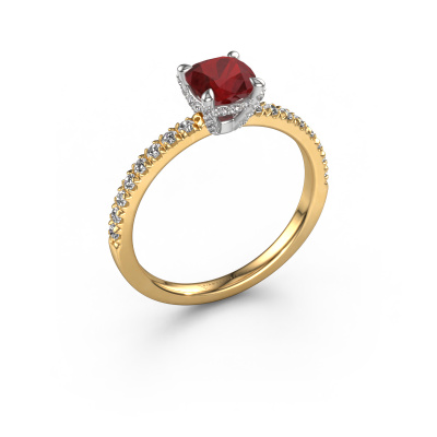 The ring shown above is called the Saskia 1 cus. We call this type of ring a pavé solitaire ring because it has one center gemstone and a band that is also pave set with gemstones. The 14 Carat gold engagement ring is set with a cushion 5.5 mm ruby center stone and the band is pave set with diamond gemstones. Each jewel is made by a team of passionate goldsmiths and jewel designers. This will make your crown jewel truly eye-catching.This unique gold pavé solitaire engagement ring has an exquisite cushion ruby center stone. To further accentuate the center stone, the band is fully set with more diamonds. Its open prong setting allows light to strike the ruby from various angles and this adds sparkle to your ruby ring. The photo shown above depicts the goldsmith's carefully handcrafted details of the ring. The high positioning of the center stone is truly eye-catching. The perfect engagement ring for the crown jewel of your life! By using a combination of the latest modern techniques, combined with ancient crafting, we can make all our engagement rings in our own studio. Each jewel is made to order. This is advantageous because we can offer you a price you won't find anywhere else.Our team adds new designs to our online collection daily. Our designers and goldsmiths work together in creating the best design. We strive to offer a diverse collection of jewels. Perhaps you have a specific jewel design in mind. One you came across somewhere. Please contact us for a free consultation. We will make you an offer, based on a fair price/ quality ratio, that will baffle you.To make it easier for you, we offer a 30 day return policy. Check our terms and conditions.