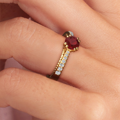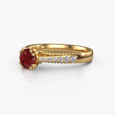 The ring shown above is called the Rozella. We call this type of ring a pavé solitaire ring because it has one center gemstone and a band that is also pave set with gemstones. The 14 Carat gold engagement ring is set with a round 5.5 mm ruby center stone and the band is pave set with lab-grown diamond gemstones. Each jewel is made to shine bright around your finger. Each jewel is hand made with love by our goldsmiths.This unique gold pavé solitaire engagement ring has an exquisite round ruby center stone. To further accentuate the center stone, the band is fully set with more lab grown diamonds. Its open prong setting allows light to strike the ruby from various angles and this adds sparkle to your ruby ring. The photo shown above depicts the goldsmith's carefully handcrafted details of the ring. The high positioning of the center stone is truly eye-catching. The perfect engagement ring for the crown jewel of your life! After receiving your order, our goldsmiths will start the creative process of making your Rozella engagement ring. We don't keep stock. This is advantageous because these costs will not be passed on to you. Therefore, we can offer jewelry at exceptionally low prices.Our designers and goldsmiths work together each day, creating new jewels. Perhaps you have found a nice unique engagement ring somewhere, which can be used to customize your unique ring. Please feel free to contact us. We will make you an offer, based on a fair price/ quality ratio, which will amaze you.To make it easier for you, we offer a 30 day return policy. Check our terms and conditions.