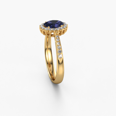 The ring shown above is called the Tilly ovl 2. We call this type of ring a cluster ring, the center gemstone is surrounded by smaller sized stones. This 14 Carat gold version is set with a 7x5 mm oval sapphire center stone, embraced by smaller lab grown diamonds. If you look at this gold cluster engagement ring, you might get the impression that its smaller sized stones collide with the bigger sapphire, so it is shaped like a flower. Therefore this engagement ring is also known as the flower ring. Our artisan goldsmiths get the job done. Each individual stone is carefully set by hand. During manufacturing, light fall is constantly monitored to make sure the special cluster effect is still visible. In the end you get the perfect engagement ring with a radiant sapphire gemstone centerpiece. You can imagine the effect of a ring of such significance when you give tot the love of your life on her special day to shine. By using our modern techniques, we can design and customize the finest quality jewels with the utmost care for you. Our engagement rings are always priced 30 percent lower than other jewelers. We make engagement rings to order so we don't have to maintain a large stock. If you have a certain budget, we are more than happy to advice you accordingly.Different styles of new rings are made daily by our team. Perhaps you have found a cluster engagement ring somewhere. One you would like to give to your loved one. Please feel free to share your thoughts and design with our jewel designers. We would love to turn your design into a classic engagement ring. You can follow the development of your ring design because we use very detailed 3D drawings. On top of that, you can order a dummy of the design. A dummy is a plastic ring, which can be shaped according your ring design. You can try it on and check if the engagement ring is up to standard. We will gladly send you a non-binding offer, based on a fair price/ quality ratio. The offer will baffle you, considering the quality of the ring and gemstones.To make it easier for you, we offer a 30 day return policy. Check our terms and conditions.
